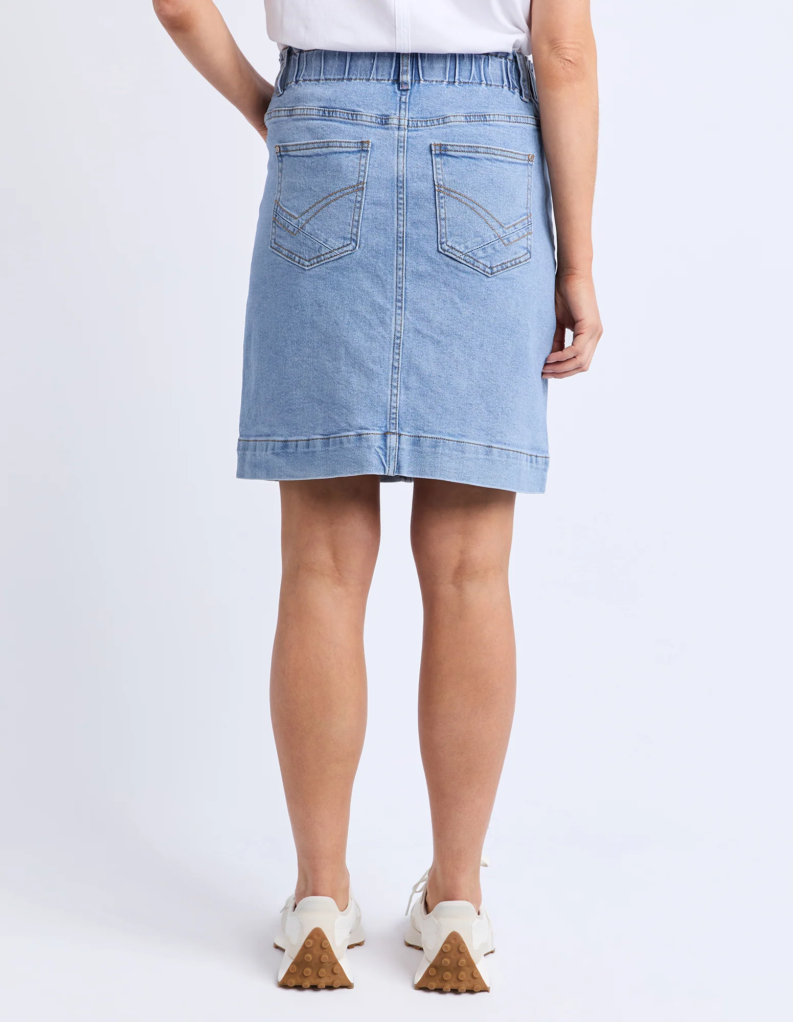 Comfort plus denim skirt for all day wear. The Atlas Denim Skirt features a comfortable elastic waist with front patch pockets and all the Elm denim bells & whistles.