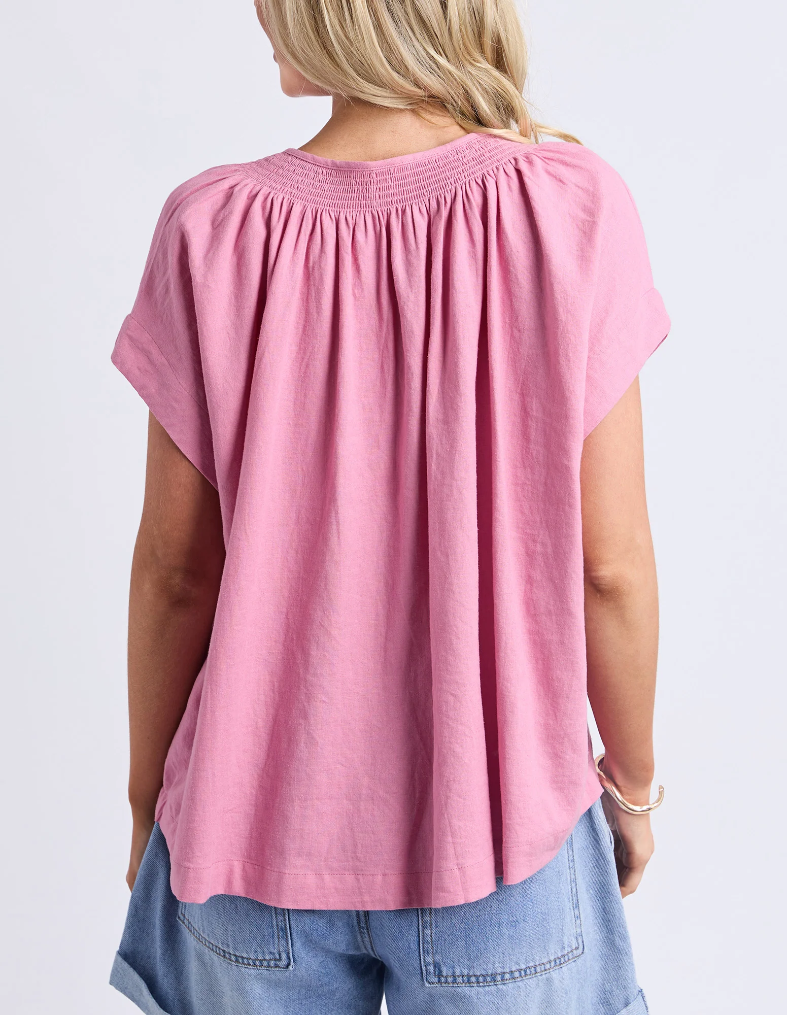 The Elm Delilah Top offers soft, feminine style with an easy oversized fit. Designed with gentle shirring around the neckline and a flowy silhouette, this linen-blend top is perfect for relaxed daywear and warm-weather dressing.