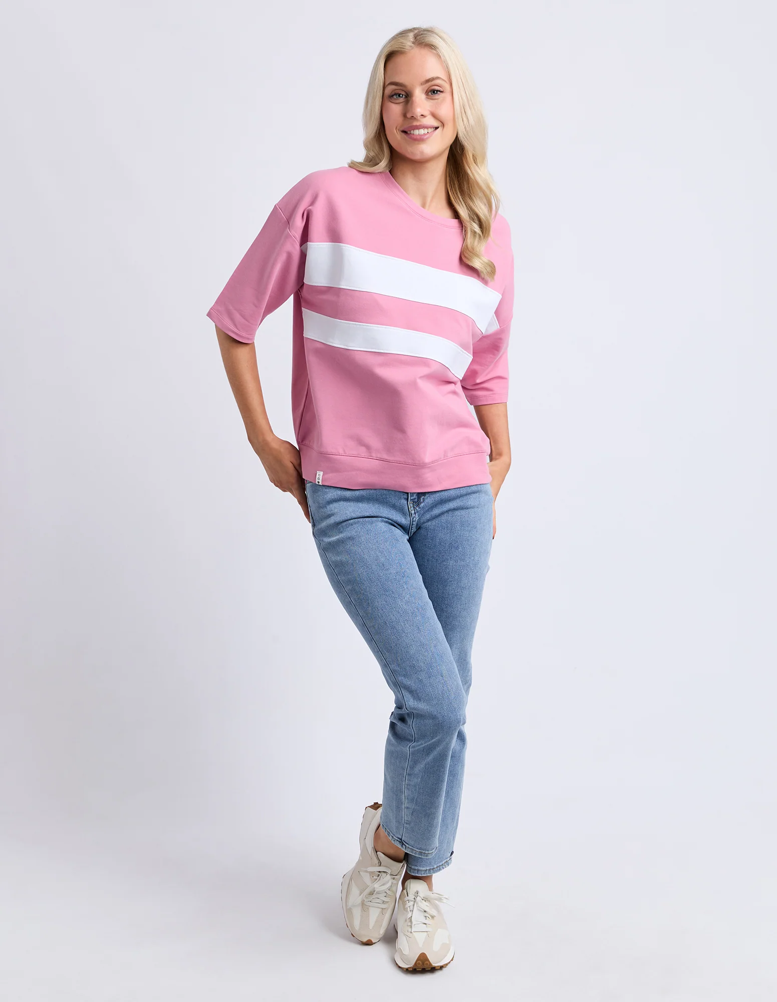 Bold and beautiful the Nico Sweat is styled on our Best Selling Mazie Top with a banded hem. The Nico features bold contrast colour stripes on the chest for an extra pop of colour.